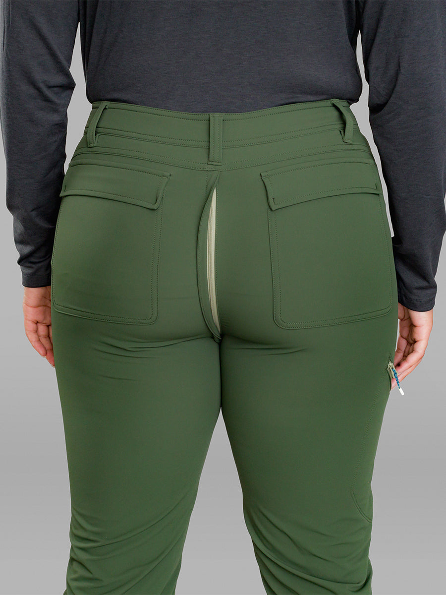 In addition to a regular zipper that allows you to take your pants on and off, a second GoFly® pee zipper extends from below that first zipper to the back of the waistband.